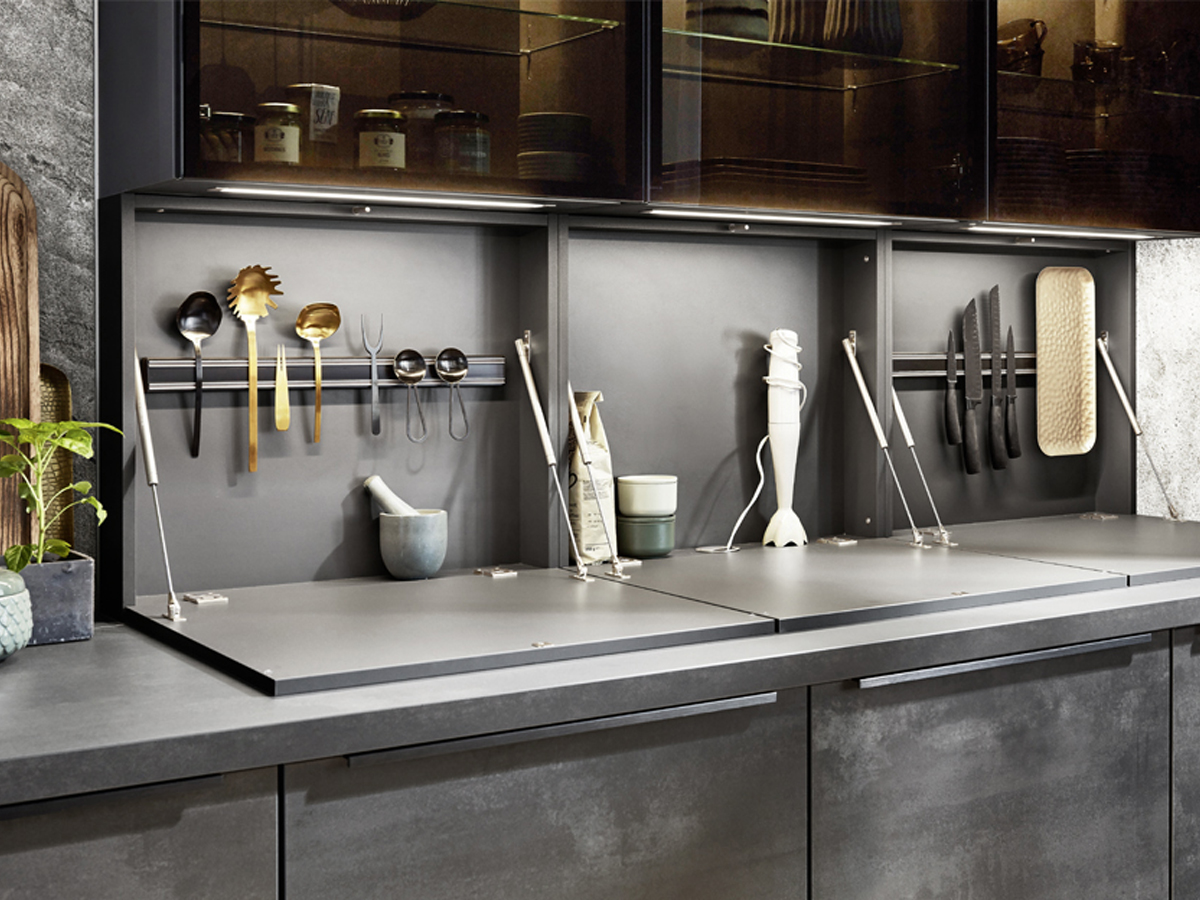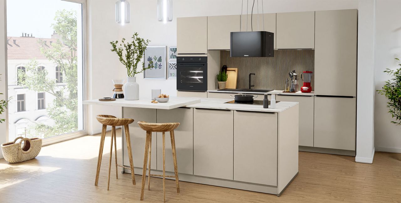 Inklusive Einbaubackofen Laurus LEB10BK Energieeffizienzklasse A, Glaskeramik Kochfeld Laurus LCA600, Inselesse Schwarz Airforce SharpBLF45 Energieeffizienzklasse A, Kühlschrank Laurus LKS88E Energieeffizienzklasse E, Einbau-Designspüle Elleci Logik 300, XL-Schränken, Essplatz.