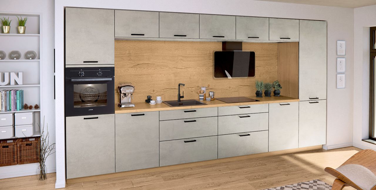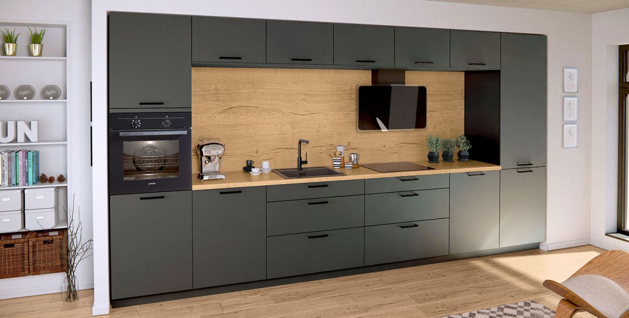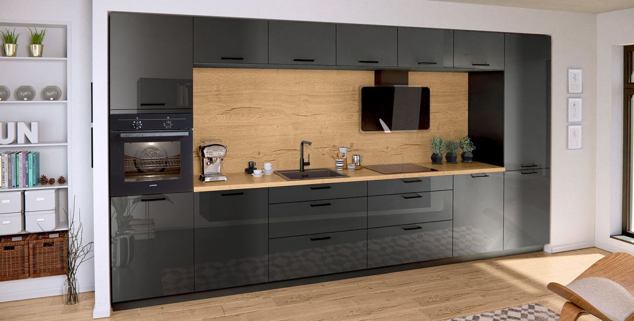 Inklusive Einbaubackofen schwarz Junker JF1300061 Energieeffizienzklasse A, Glaskeramik Kochfeld Junker JR36DT54, Dunstesse Edelstahl / Glas Faber GLAM-FIT BK80 Energieeffizienzklasse A, Kühlschrank mit **** Gefrierfach Progress PK0855 Energieeffizienzklasse E, Einbau-Designspüle Elleci Logik 300, XL-Schränken, Unterschränken mit Frontauszügen.