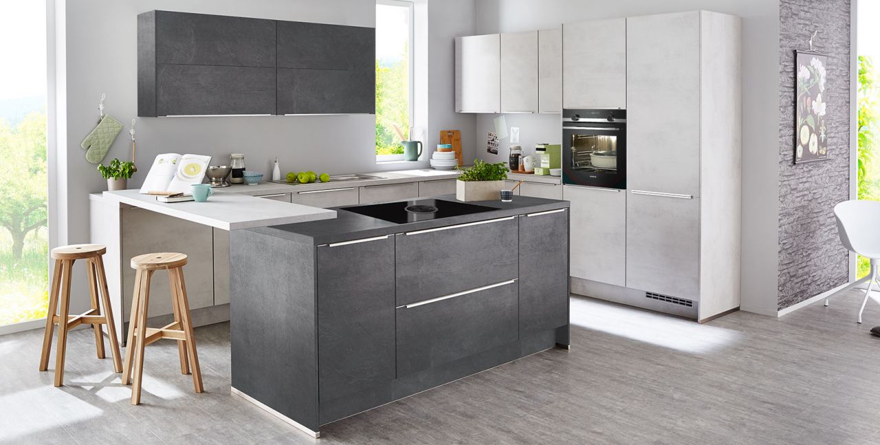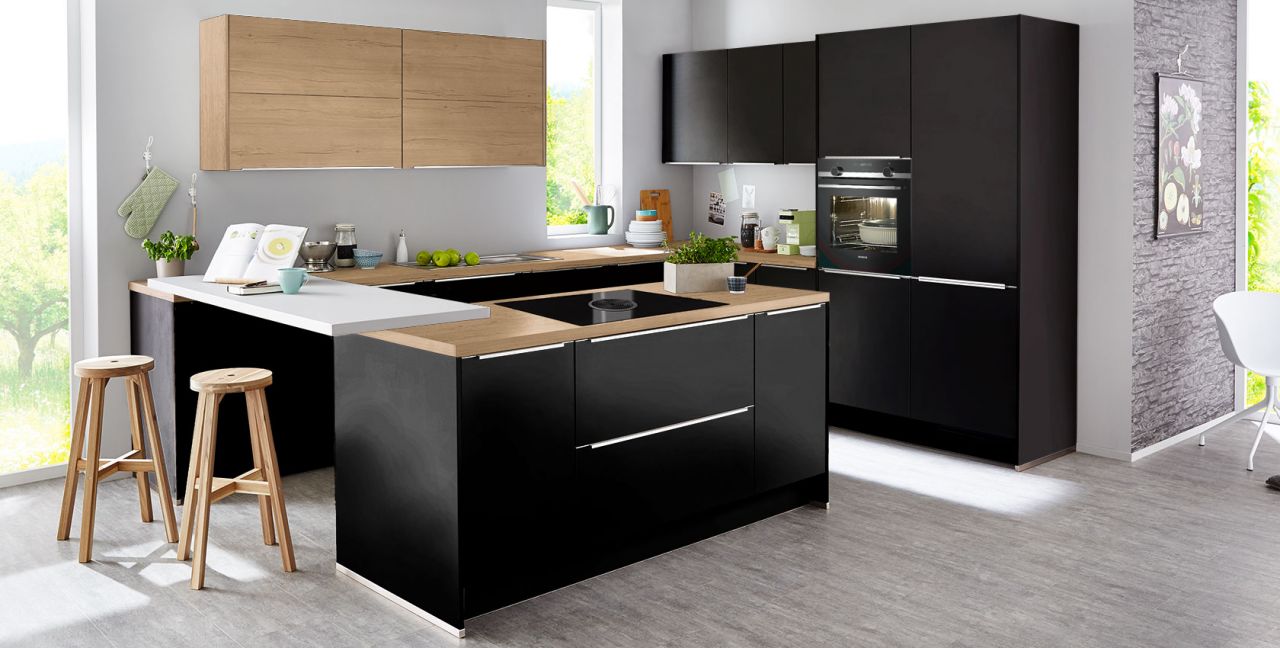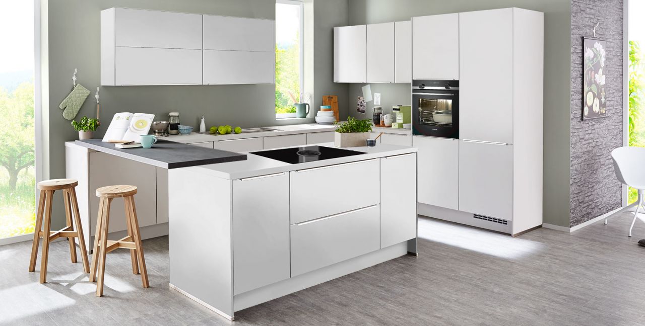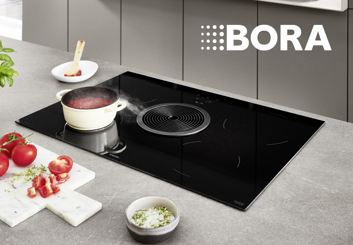 Inklusive Einbaubackofen in Schwarz / Edelstahl Siemens HB517GBS3 Energieeffizienzklasse A+, Glaskeramik Kochfeld mit Induktion und Kochfeldabzug (Umluft) Bora GP4U, Kühlschrank Progress PK0814 Energieeffizienzklasse E, Einbauspüle Edelstahl Rodi Okio Line 85 Deep, Unterschrank mit Großraumauszügen, Wandschränken mit Falt-Lifttür, Esstheke.