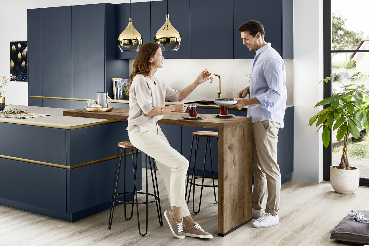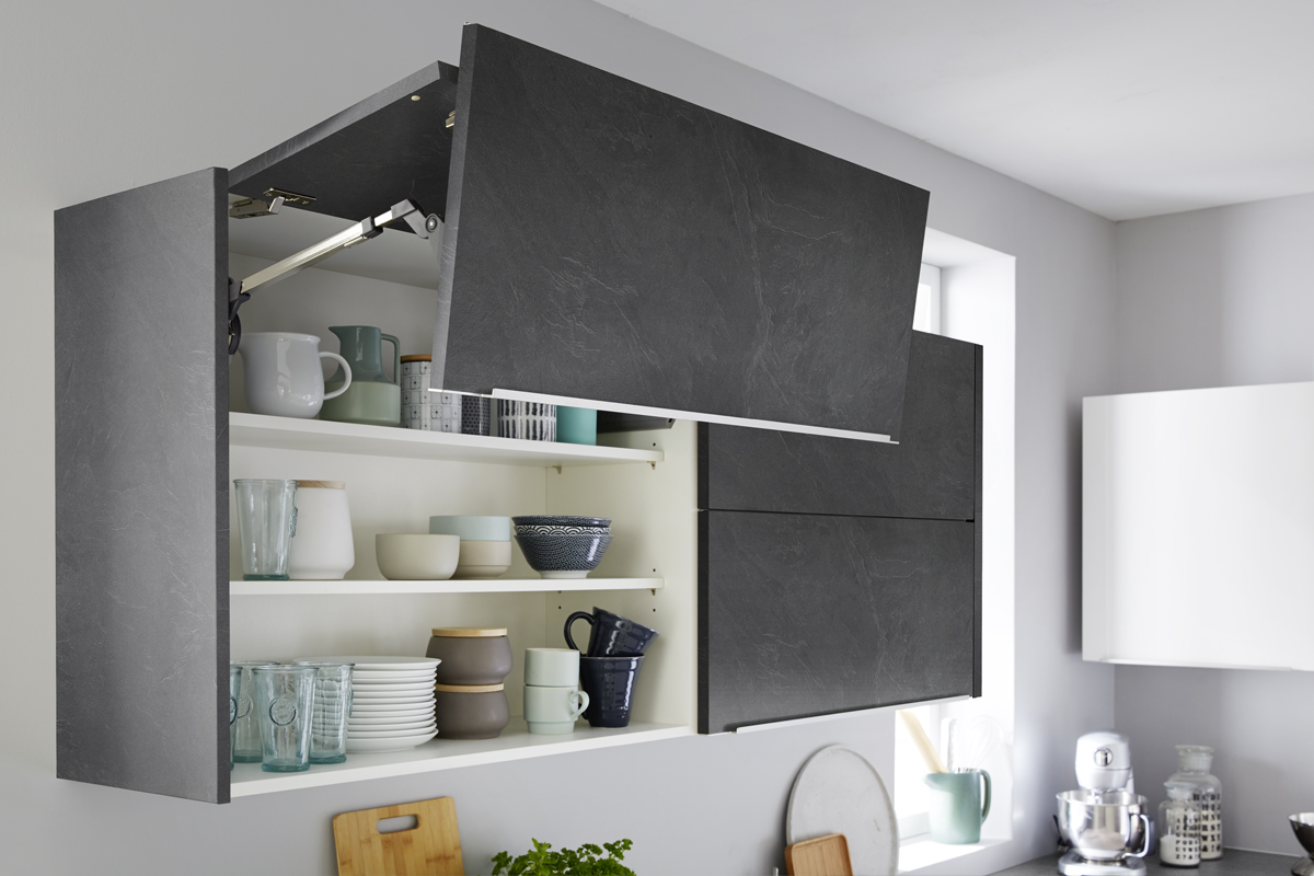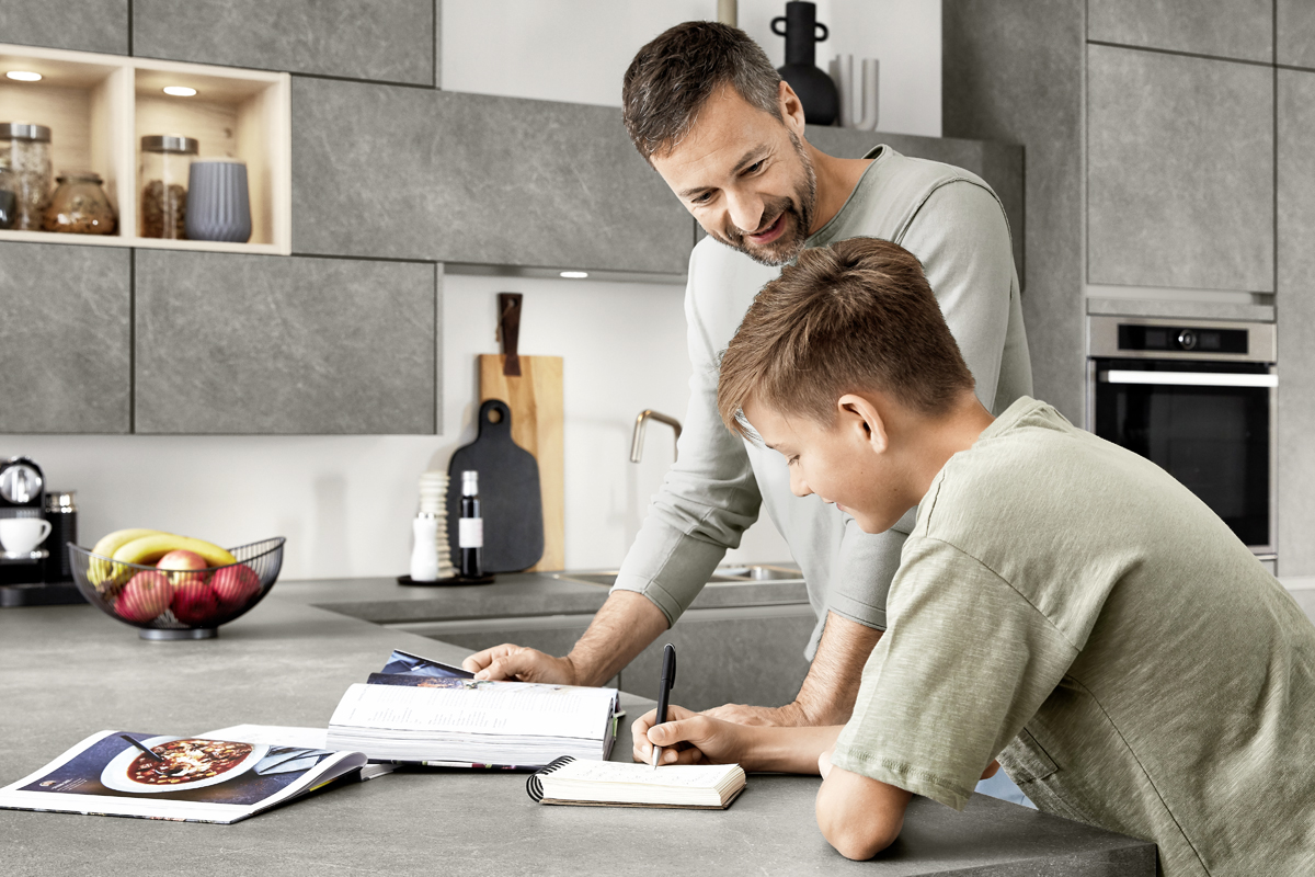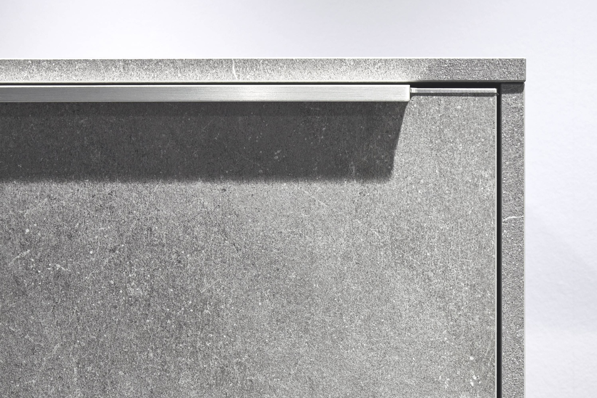 Inklusive Einbaubackofen in Schwarz / Edelstahl Siemens HB517GBS3 Energieeffizienzklasse A+, Glaskeramik Kochfeld mit Induktion und Kochfeldabzug (Umluft) Bora GP4U, Kühlschrank Progress PK0814 Energieeffizienzklasse E, Einbauspüle Edelstahl Rodi Okio Line 85 Deep, Unterschrank mit Großraumauszügen, Wandschränken mit Falt-Lifttür, Esstheke.